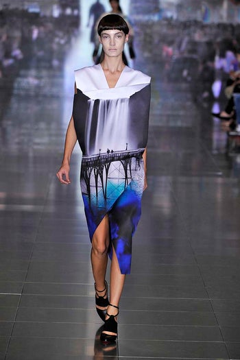 Beyond prints, Katrantzou is a master of structure, and though her wide-angle skirts have fallen by the wayside for now, there were plenty of architectural details to admire. In keeping with the Asian feeling of her landscape prints, the designer delivered strong origami folds at the bodices, with sharp angular cuts along the bias. Sculptural, rounded shoulders also dominated, particularly with a black, embossed leather dress that dropped mid-calf.